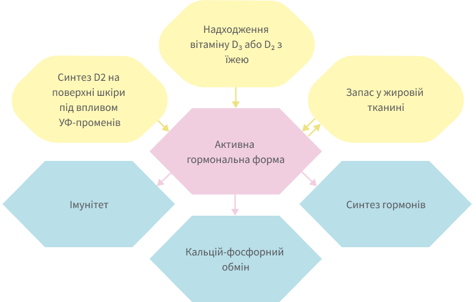 До того ж це єдиний вітамін, який працює як гормон і регулює обмін речовин в організмі. З недостатнім синтезом вітаміну D у холодну пору року деякі вчені пов’язують розвиток «осінньої хандри» та більшої схильності організму до вірусних захворювань.